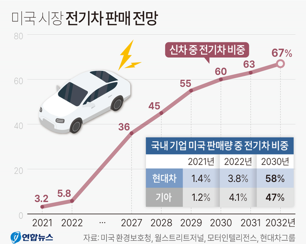 현대자동차와 기아의 작년 미국 내 전기차 판매 비중이 3.9%였다. 2030년까지 현대차는 이를 58%, 기아는 47%로 높인다는 목표이지만 새 기준을 맞추려면 한층 더 바빠지게 됐다. 판매 비중을 10~20%p 높여야할 상황이다.