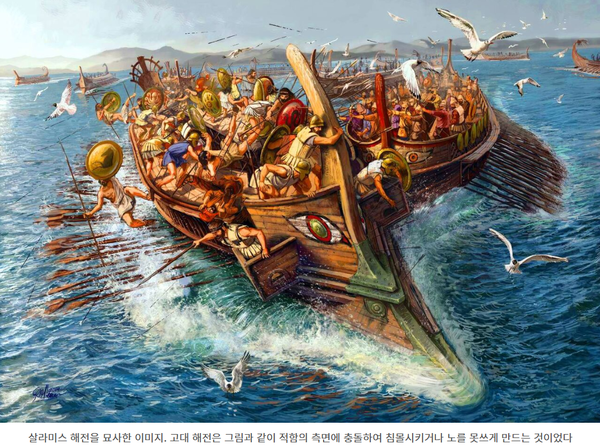 당시 만들어진 3단 갤리선은 노를 힘껏 저어서 적군의 전함에 부딪혀 박살하는 방식으로 전투를 치렀다. 가장 중요한 전투 주역은 배 안으로 들어가 노를 젓는 노잡이들이었다. 그들은 노를 젓다가 함선끼리 맞부딪혀서 전투가 벌어지면 병사로 변신해 싸웠다.