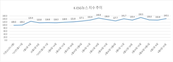 본지 부설 ESG경제연구소가 자체 개발한 ‘K-ESG 뉴스지수’의 18일 분석 결과, 4월 셋째 주(4월 9~15일) ESG종합지수는 143.1로 전주인 4월 둘째 주(4월 2~8일)에 견줘 10.3포인트 올랐다. 2주 연속 하락 후 두자릿수 반등이다.