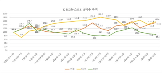 ◇ K-ESG뉴스지수 : 국내 54개 주요 신문과 방송에 보도된 ESG 관련 뉴스(주당 평균 5000건)의 ESG 요소(키워드)들 중 긍정, 부정 내용을 평가하여 점수화한다. 지수는 E/S/G 요소별 분야와 ESG종합으로 각각 발표한다. 2021년 1분기 점수를 100(기준점)으로 해 산출한다. 지난주 ESG 관련 뉴스는 4783건으로 집계됐다.