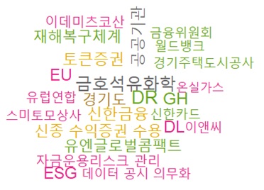E, S, G 부문별 지수를 보면, E지수가 12.8포인트로 가장 높게 상승했다. 청정, 환경기술, 청정에너지, 해상풍력, 탄소중립 등 단어가 늘고, 탄소중립을 위한 기술 관련 기사가 많았다. S지수 역시 9.7 포인트 상승하면서 4주 만에 겨우 반등했다. 봉사단, 나눔, 봉사활동, 동반성장, 중소기업 지원 단어가 증가한 덕분이었다.