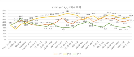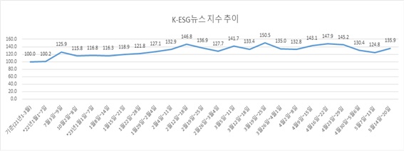 본지 부설 ESG경제연구소가 자체 개발한 ‘K-ESG 뉴스지수’를 22일 분석한 결과, 5월 셋째 주(5월 14~20일) ESG종합지수는 135.9로 전주인 5월 둘째 주(5월 7~13일) 대비 11.1포인트 상승했다. 종합지수의 하락이 3주만에 멈춘 것이다.