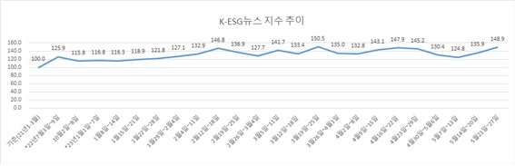 본지 부설 ESG경제연구소가 자체 개발한 ‘K-ESG 뉴스지수’를 30일 분석한 결과, 5월 넷째 주(5월 21~27일) ESG종합지수는 148.9로 그 전주인 5월 셋째 주(5월 14~20일) 대비 13포인트 상승했다. 지난 5월 셋째주 종합지수가 3주만에 하락세를 멈추고 상승한 뒤 2주 연속 두자릿수 오른 것이다.