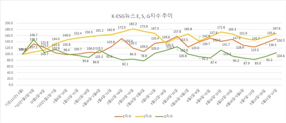 E지수가 14포인트로 가장 높게 상승했다. 저탄소, 환경교육, 에너지 솔루션, 녹색 채권, 수소 에너지 등의 단어가 많이 증가한 덕분이다. S지수 역시 12.2포인트 상승하면서 2주만 연속 올랐다. 갑질 같은 단어가 증가했으나 상생, 장학금, 기부금, 양성평등, 지역상생 등 단어도 늘면서 상승세를 이어갔다.
