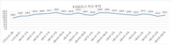 8일 본지 부설 ESG경제연구소가 자체 개발한 자체 개발한 ‘K-ESG 뉴스지수’ 분석을 보면, 8월 첫째 주(7월 30일~8월 5일) ESG종합지수는 125.1로 올해 최저치였던 그 전주(7월 23일~29일) 115.2에 견줘 9.9포인트 상승했다.