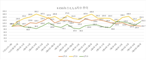 E, S, G 부문별 지수를 보면, G(거버넌스)지수 상승이 단연 두드러졌다. G 지수는 131.5로 그 전주 105.2에 견줘 26.3포인트나 오르며 종합지수 상승을 주도했다. ‘지속가능 성장’ 등의 긍정적인 단어가 많아진 반면 과징금 등의 부정적인 단어는 감소했기 때문으로 분석된다.