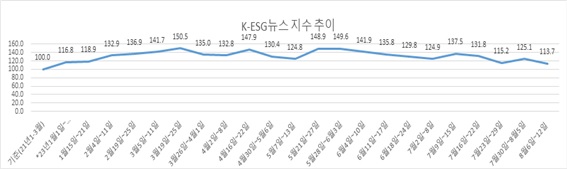 14일 본지 부설 ESG경제연구소가 자체 개발한 자체 개발한 ‘K-ESG 뉴스지수’ 분석을 보면, 8월 두번째 주(8월 6~12일) ESG종합지수는 113.7로 그 전주(7월 30일~8월 5일)에 견줘 11.4포인트 하락했다. 이런 지수는 올해 최저치였던 7월 다섯째 주(7월 23~29일) 115.2포인트보다 낮은 수준이다. 8월 초 휴가철로 기업과 금융기관 등의 관련 활동이 뜸했기 때문으로 분석된다.