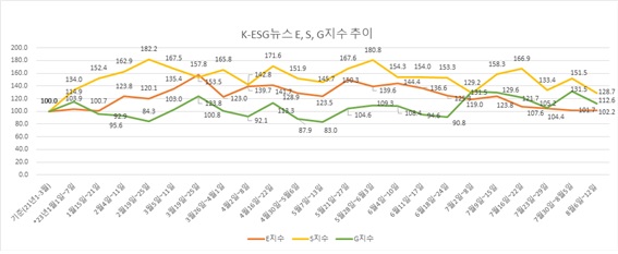 E(환경)지수는 에너지 절약, 친환경 캠페인, 친환경 경영 단어가 증가했지만 탄소중립 온실가스 등의 단어가 감소하면서 0.5포인트 소폭 상승했다.