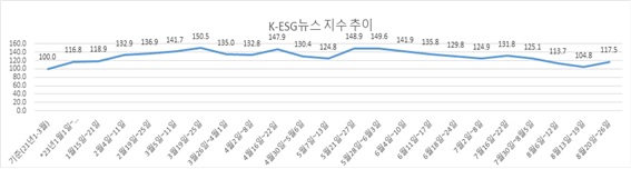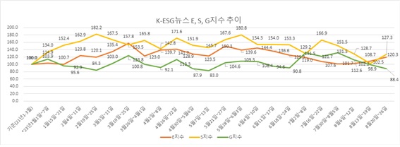 28일 본지 부설 ESG경제연구소가 자체 개발한 ‘K-ESG 뉴스지수’ 분석을 보면, 8월 넷째 주(8월 20일~26일) ESG종합지수는 117.5로 그 전주인 8월 셋째주(8월 13일~8월 19일)에 견줘 12.7포인트 상승했다. 8월 셋째주 올해 최저치였던 104.8에서 가까스로 반등에 성공한 것이다.