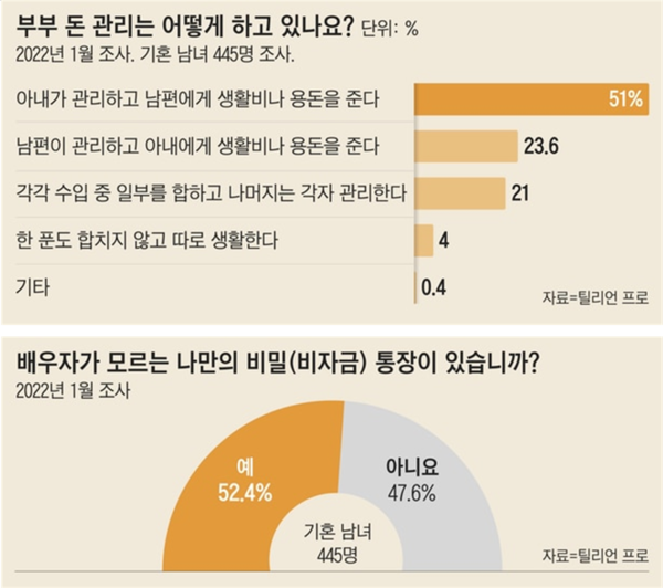 ‘남편이 관리하고 아내에게 용돈을 준다’는 24%로 뚝 떨어졌다. 나머지는 각자 관리다. 또한 “배우자가 모르는 비자금 통장이 있습니까?”라는 질문에 53%가 “그렇다”고 대답했다. 상당한 비율이다.