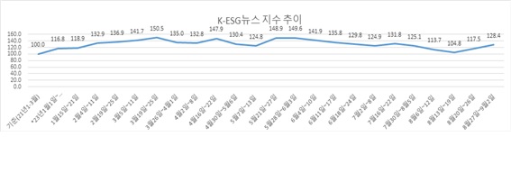 4일 본지 부설 ESG경제연구소가 자체 개발한 ‘K-ESG 뉴스지수’를 분석한 결과, 9월 첫째 주(8월 27일~9월 2일) ESG종합지수는 128.4로 그 전주인 8월 넷째 주(8월 20~26일)에 견줘 10.9포인트 상승했다.