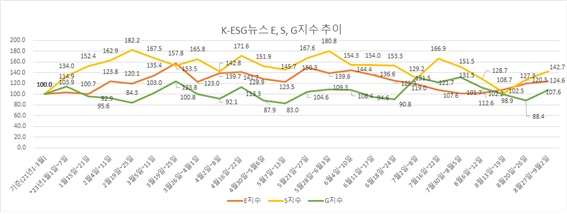 E(환경)지수는 탄소 중립, 에너지 솔루션, 녹색 성장, 수소 에너지 등의 긍정 단어가 증가했지만 그린 워싱 같은 부정 단어도 늘면서 4.3포인트 상승에 그쳤다.
