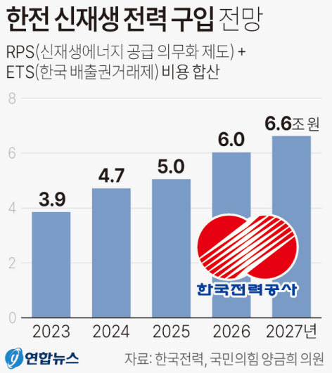 한전의 2023∼2027년 RPS 비용과 ETS 비용의 합계는 올해 3조8,501억원, 2024년 4조7,129억원, 2025년 5조436억원, 2026년 6조213억원, 2027년 6조6,156억원으로 전망되고 있다. 4년 뒤인 2027년에는 한전이 신재생에너지를 사는 데 쓰는 비용이 올해보다 71.8%나 늘어난다.