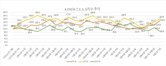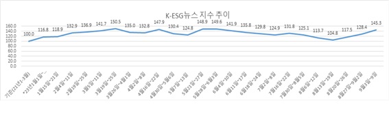 11일 <ESG경제> 부설 <ESG경제연구소>가 자체 개발한 ‘K-ESG 뉴스지수’를 분석한 결과, 9월 둘째 주(9월 3~9일) ESG종합지수는 145.3으로 그 전주인 9월 첫째 주(8월 27일~9월 2일)에 견줘 16.9포인트 상승했다.