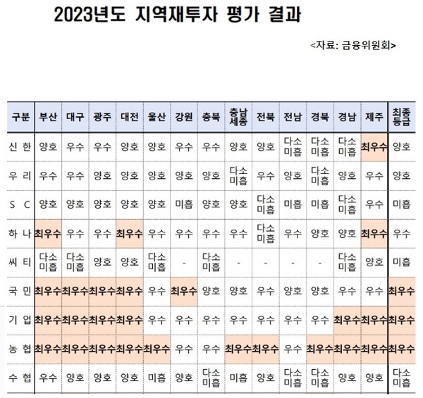 14일 금융위원회의 ‘2023년 금융회사 지역재투자 평가’ 결과를 보면, 시중은행 가운데 KB국민·기업·NH농협이 최우수 등급을 획득한 반면, SC 한국시티은행은 미흡 평가를 받았다. 우수 등급에는 하나, 양호에는 신한·우리, 다소 미흡에는 수협이 포함됐다.