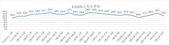 18일 본지 부설 ESG경제연구소가 자체 개발한 ‘K-ESG 뉴스지수’를 분석한 결과, 9월 셋째 주(9월 10일~16일) ESG종합지수는 122.2로 그 전주인 9월 둘째 주(9월 3일~9월 9일)에 견줘 23.1포인트 떨어졌다.
