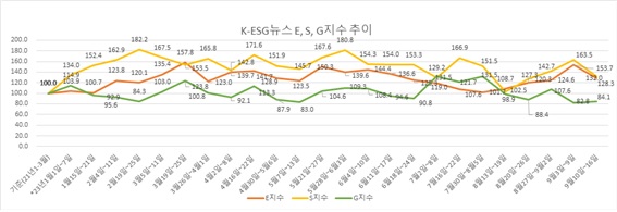 E, S, G 부문별 지수를 보면, S(사회) 지수가 31.5 포인트로 가장 큰폭으로 하락했다. 그 전주 인도의 G20 정상회담이 끝나면서 양성 평등, 동반 성장, 일자리 창출 등의 긍정 단어 언급이 줄어든데다 부정적인 아동학대 같은 단어가 증가했기 때문이다. 이로써 S지수는 두 자릿수 상승은 4주 만에 끝났다. E(환경) 지수 역시 25.4 포인트 크게 하락했다. S지수아 마찬가지로 G20 정상회담이 끝나면서 저탄소, 청정에너지, 온실가스 감축 같은 긍정 단어의 빈도가 하락한 탓이다.