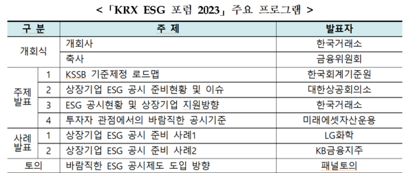 한국거래소(이사장 손병두)는 10월 31일 “바람직한 국내 ESG 공시제도 도입방향”을 주제로「KRX ESG 포럼 2023」을 개최한다.