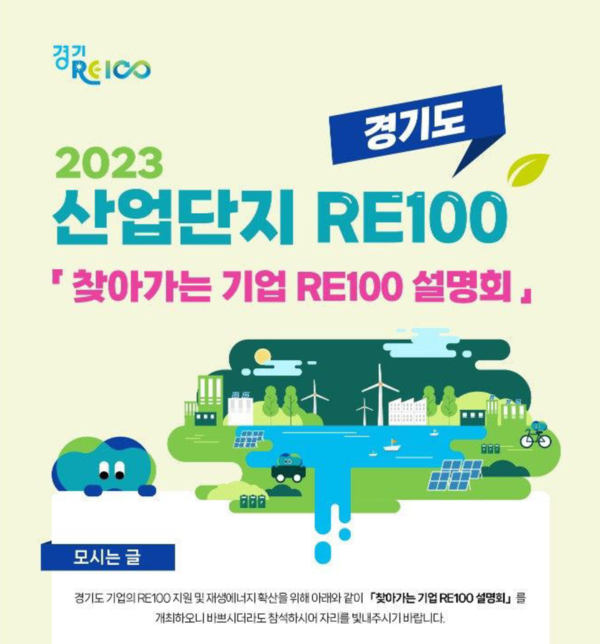 경기도가 도내 ‘산업단지 RE100’ 사업 홍보 및 참여기업 모집을 위해 오는 22일부터 ‘찾아가는 기업 RE100 설명회’를 연다.