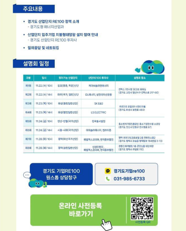 경기도가 주최하고 경기환경에너지진흥원이 주관하는 이번 설명회는 경기산단 RE100 사업의 8개 협약 투자 업체와 1회씩, 총 8회 개최된다.