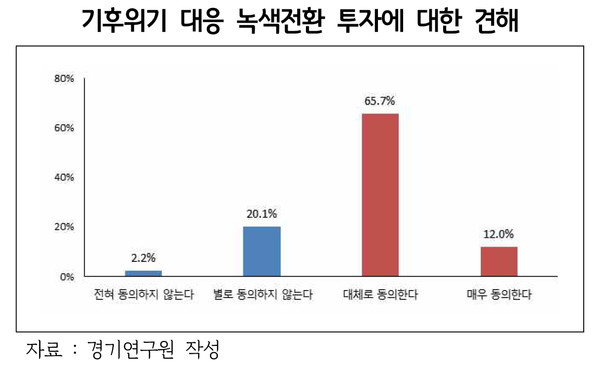 경기도민들은 이러한 상황에도 녹색전환 투자의 중요성은 인식하고 있었다. 기후위기 대응 녹색전환 투자가 경기도에 새로운 기회를 가져다줄 것으로 보느냐는 질문에 77.7%가 동의했고, 거주 지역에 재생에너지 시설이 들어서는 것도 79.2%가 긍정적으로 응답했다.