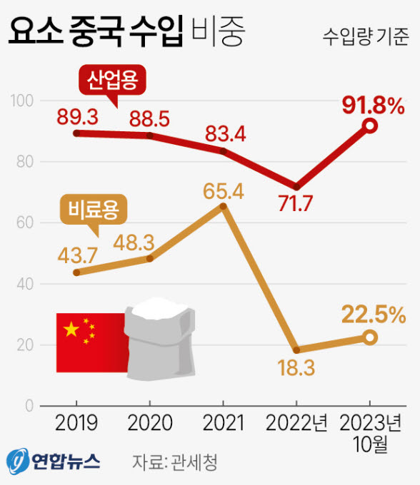 중국 해관총서(한국의 관세청에 해당) 통계를 보면 올해 1∼10월 중국의 요소 수출량은 339만t이었다. 한국은 올해 10월 기준 산업용 요소의 91.8%를 중국에서 수입한다.