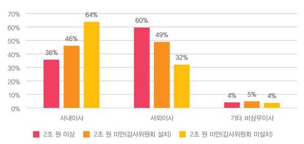 보고서에 따르면 이사회의 사외이사 비율은 평균 51%였으며, 2조 원 이상 회사의 경우 60%, 2조 원 미만 회사는 42%로 차이가 났다. 거버넌스센터는 이러한 차이가 상법이 요구하는 최소한의 비율(2조 원 이상 회사는 과반수, 그 외 4분의 1 이상)에 영향을 받아 요건을 맞춘 것으로 보인다고 분석했다.