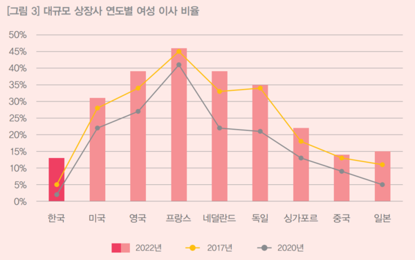 한국의 여성 이사 비율은 미국, 영국, 프랑스 등 다른 선진국들과 비교해보아도 현저히 낮았다. 자본시장법에는 이사회 전원이 특정 성별로만 구성되지 않아야 한다는 규정이 있으나, 이를 위반하고 여성 이사를 두지 않은 회사에 대해서 별도의 제재 규정은 없다.