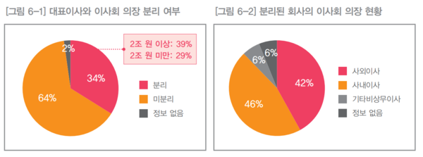 이사회의 독립성을 파악할 수 있는 중요한 지표인 대표이사와 이사회 의장의 분리 비율은 34%에 그쳤다. 2조 원 이상 회사는 39%, 2조 원 미만의 회사는 29%가 대표이사와 이사회 의장을 분리해 운영하고 있었다. 나머지는 회사 경영진을 대표하는 CEO가 경영진을 견제해야 하는 이사회의 의장을 동시에 맡아, 본인이 본인을 '견제ㆍ감시'하는 모순적 역할을 하고 있다는 얘기다.