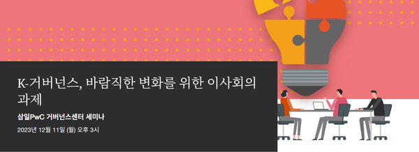 [ESG경제=김현경 기자] 삼일PwC 거버넌스센터는 오는 11일 'K-거버넌스, 바람직한 변화를 위한 이사회의 과제'를 주제로 한 세미나를 개최한다.