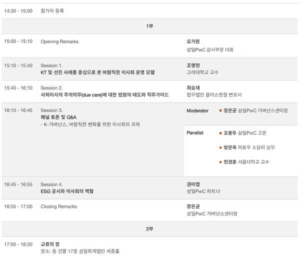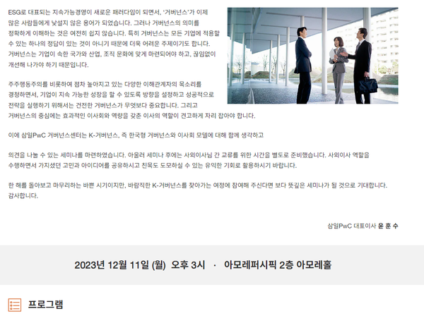 본 세미나는 사외이사 및 감사위원을 대상으로 하며, 참가 신청은 하단 링크로 연결되는 삼일PwC 홈페이지에서 할 수 있다.