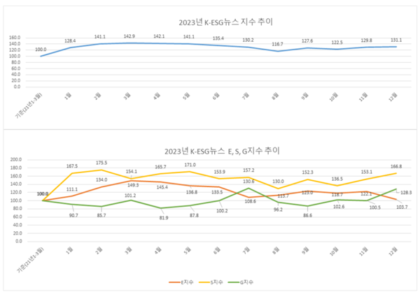 한편 본지 부설 ESG 경제연구소가 자체 개발한 ‘K-ESG 뉴스지수’를 분석한 결과, 2023년 ESG종합지수는 평균 132.4로 기준점인 2021년 1-3월(100.0)과 비교해봤을 때 32.4포인트 상승했다. 월별로는 3월이 142.9로 가장 높았다.