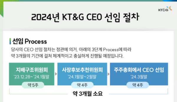 이에 대해 KT&G 관계자는 “지배구조위원회가 1월 말 사장 후보 심사대상자(쇼트리스트)를 확정하기 전에 외부 전문가로 구성된 인선자문단의 의견을 구할 것”라며 사장 선출 과정의 투명성 확보방안을 마련하고 있다고 설명했다.