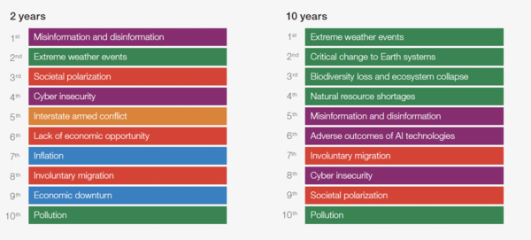 세계경제포럼(WEF, 일명 다보스포럼)은 10일 ‘2024년 글로벌 리스크 보고서’를 발표했다. 보고서는 각 분야의 전문가 1490명을 대상으로 실시한 ‘글로벌 리스크 인식조사(GRPS)’의 결과를 바탕으로 구성됐다. 보고서는 ▲당해(2024년) ▲단기(2~5년) ▲장기(5~10년) 등 각 기간에 따른 리스크 요소를 분석했다.