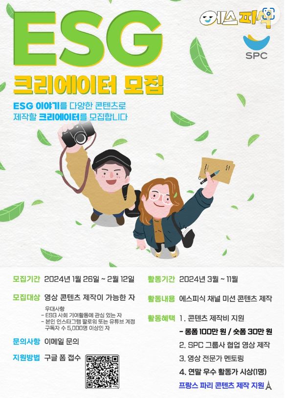 SPC그룹은 소비자와 함께하는 ‘ESG 경영’을 실천하고자 오는 12일까지 ‘2024 ESG 크리에이터’를 모집한다고 6일 밝혔다. 선발된 크리에이터는 프랑스 파리 현지의 파리바게뜨 매장을 직접 체험하고 영상 콘텐츠를 제작하게 된다.