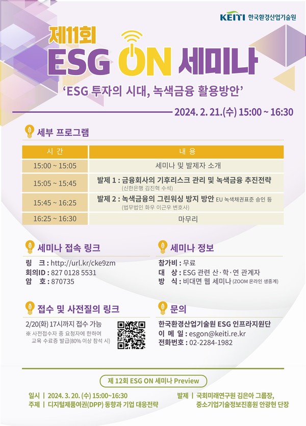 한국환경산업기술원은 오는 21일, 'ESG 투자의 시대, 녹색금융 활용방안'을 주제로 한 비대면 웹 세미나를 개최한다. 신한은행 김진혁 수석과 법무법인 화우 이근우 변호사가 각각 '금융회사의 기후리스크 관리 및 녹색금융 추진전략'과 '녹색금융의 그린워싱 방지 방안'에 대해 발제를 맡았다.