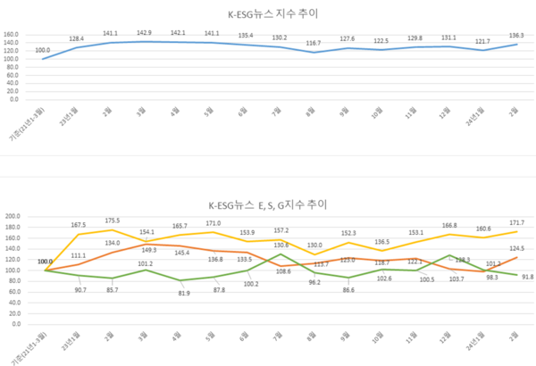 한편 본지 부설 ESG 경제연구소가 자체 개발한 ‘K-ESG 뉴스지수’를 분석한 결과, 2024년 2월 ESG종합지수는 136.3으로 ‘24년 1월(121.7)과 비교해 봤을 때 14.6포인트 상승했다.