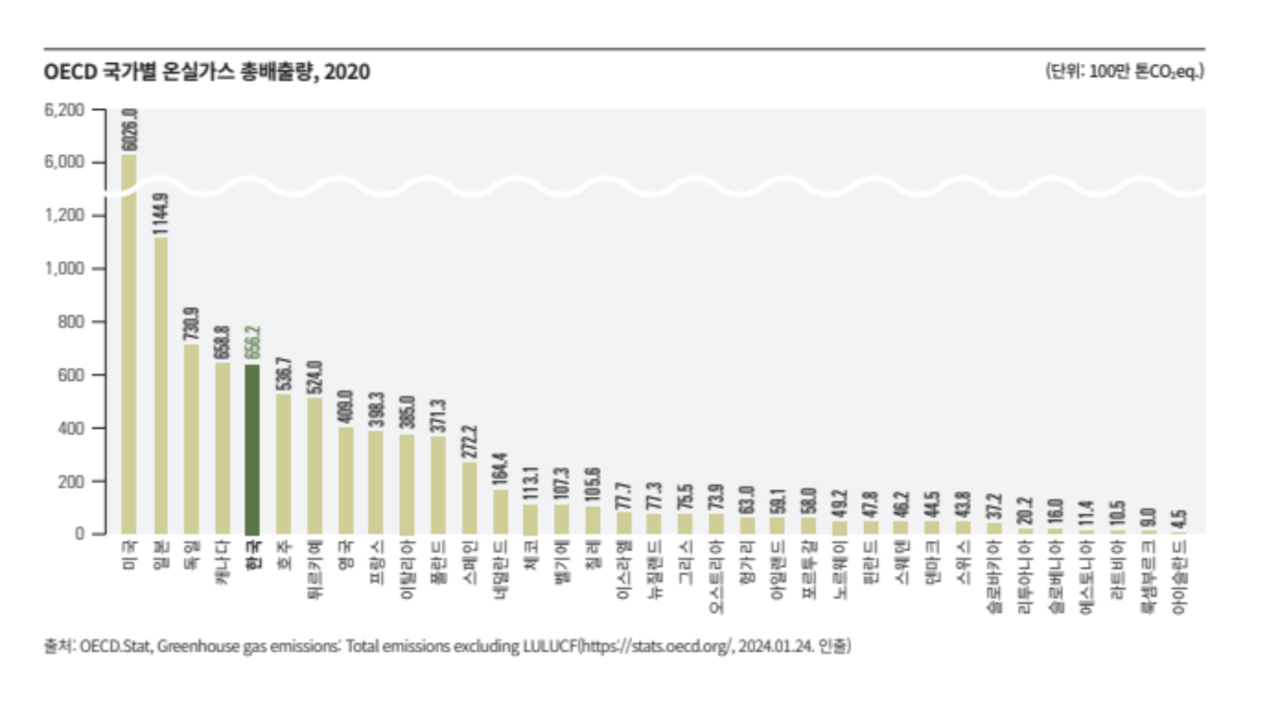 그에 비해 온실가스 배출량은 오히려 증가하고 있다. 보고서에 따르면 한국의 온실가스총배출량은 2021년 기준 6억 7660만 톤으로 전년대비 3.4% 증가한 수치였다. GDP당 온실가스 배출량 기준 국제비교 결과, 한국은 호주, 캐나다, 뉴질랜드, 미국, 폴란드 다음으로 높은 6위였다.