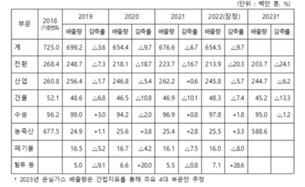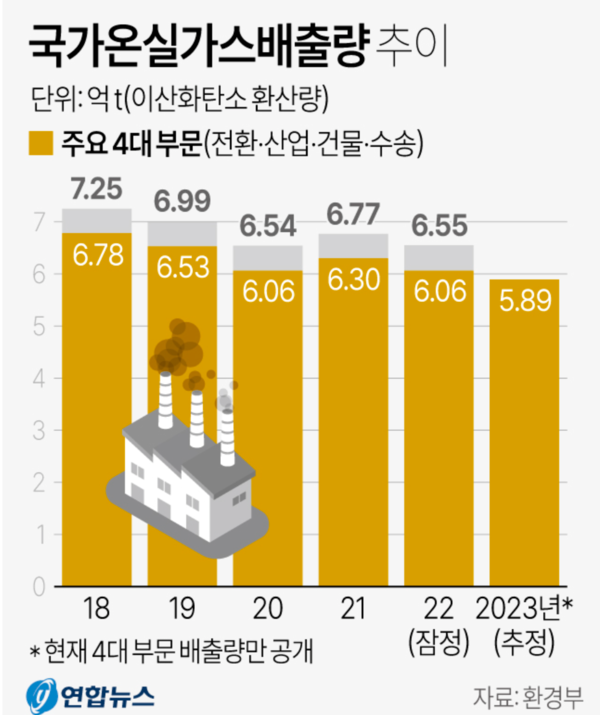 작년 4개 부문 온실가스 배출량 추산치를 국가온실가스배출량이 정점을 찍은 해이자 현행 '2030년 NDC'의 기준연도인 2018년과 비교하면 13.1% 줄어든 것이다.