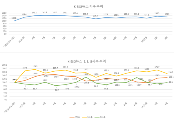 한편 본지 부설 ESG 경제연구소가 자체 개발한 ‘K-ESG 뉴스지수’를 분석한 결과, 2024년 3월 ESG종합지수는 131.5으로 ‘24년 1월(121.7)과 비교해 봤을 때 9.8포인트 상승했지만 ’24년 2월(136.3) 대비로는 4.8포인트 하락했다.