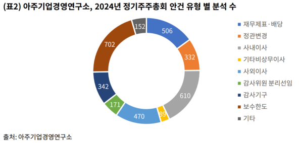 아주기업경영연구소는 2024년 정기 주주총회를 개최한 시가총액 상위 500개 기업을 대상으로 의안분석을 실시했다. 안건 유형별 수는 재무제표·배당 506건, 정관 332건, 이사선임 1682건, 이사 보수한도 501건, 감사 보수한도 201건, 기타 152건이었다.