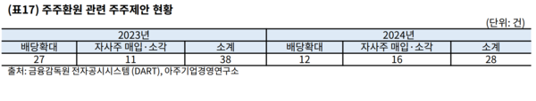 16일 아주기업경영연구소가 발표한 2024 정기 주주총회 리뷰에 따르면 올해 정기주주총회 기간 동안 자사주 매입 및 소각과 관련한 주주제안 안건 수는 지난해 11건에서 올해 16건으로 5건 늘어났다. 또한 한미사이언스·금호석유화학 등의 기업에서 경영권 분쟁이 일어나며 소액주주들의 중요성이 부각되고 주주친화적 제안이 확대됐다.