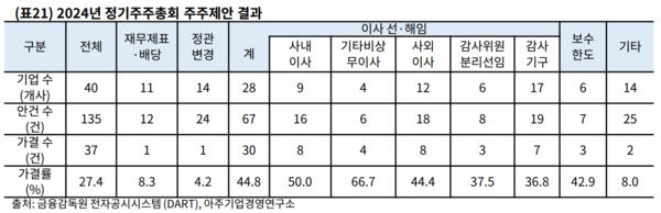 전반적인 주주제안 안건의 가결률은 높아졌다. 연구소의 조사에 따르면 2024년 정기주주총회에서 주주제안 안건이 상정된 기업은 총 40개사(유가증권시장 15개사, 코스닥시장 25개사)로 전년 대비 11.11% 감소했고 주주제안으로 상정된 안건의 수도 135건으로 전년 대비 15.63% 감소했다.