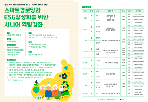 서울 강남구청(조성명 구청장)은 생활 속의 ESG 확산을 위하여 2024년 5월 13일부터 6월 27일까지 강남구 어르신들을 대상으로 한 '스마트 경로당과 ESG 활성화를 위한 시니어 역량강화 교육'을 실시한다.