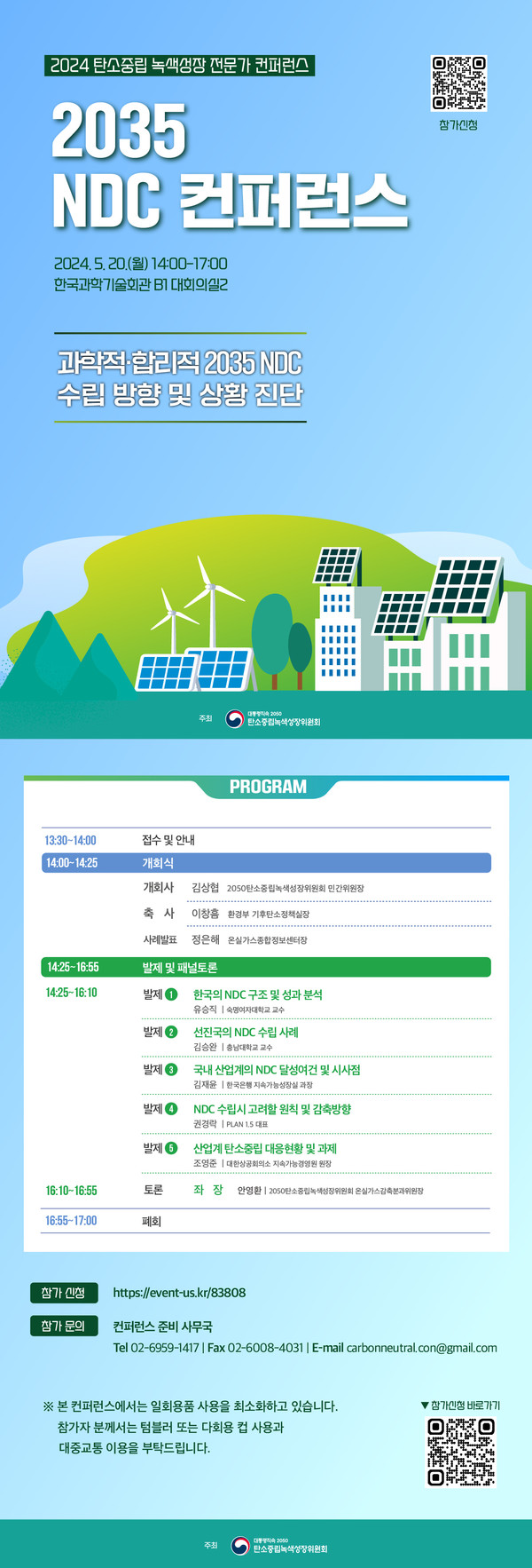 오는 20일 한국과학기술회관에서 참가신청 링크 : https://event-us.kr/carbonneutral/event/83808 관련기사 정부, 2035년 NDC 수립 시동...내년 유엔에 제출해야 저작권자 © ESG경제 무단전재 및 재배포 금지 키워드 Tags #2035 NDC #탄소중립녹색성장위원회 #탄녹위 #환경부 #온실가스종합정보센터 김현경 기자 news@esgeconomy.com 다른기사 보기 SNS 기사보내기 페이스북(으)로 기사보내기 트위터(으)로 기사보내기 카카오톡(으)로 기사보내기 URL복사(으)로 기사보내기 이메일(으)로 기사보내기 다른 공유 찾기 기사저장 당신만 안 본 뉴스 공시는 잘하는데 사고는 막지 못한다…국내기업 ESG 실행력 위기 사인 글로벌, 시에라리온 ‘국가 블록체인’ 만든다 美정부, 日 대미 투자금으로 원전 10기 짓는다 CJ제일제당에 무슨 일이...공정위 '담합' 조사에 검찰 수사까지 LS 중복상장 공방...전 상장사 8~18% 중복상장 문제에 노출 진옥동 신한금융 회장 연임에 쏠린 눈...비은행 실적 개선 관심 삼성전자 '투톱 체제'로…AI·반도체 미래 전략 가속 공시는 잘하는데 사고는 막지 못한다…국내기업 ESG 실행력 위기 댓글삭제 삭제한 댓글은 다시 복구할 수 없습니다. 그래도 삭제하시겠습니까? 비밀번호 닫기 기사 댓글 0 댓글 접기 로그인 후 이용 가능합니다. 댓글 내용입력 비회원 로그인 이름 비밀번호 댓글 내용입력 댓글쓰기 계정을 선택하시면 로그인·계정인증을 통해 댓글을 남기실 수 있습니다. 회원 로그인 비회원 글쓰기 이름 비밀번호 자동등록방지 로그인 옵션 창닫기 주요기사 SBS '좋은 아침' 박정호 한의사 '속 체온 저하, 염증 악순환 신호' ‘삼양식품 자사주 선제 매각’ 논란 확산…“자산 취급 나쁜 선례” AI 데이터센터는 “고탄소 위험 자산”...녹색금융 쳬계 필수적 [김광기 칼럼] 자사주 소각, 법으로 강제할 일 아니다 성훈한의원, 겨울철 피부·여성질환 특화 위해 이혜성 원장 영입 한가온컴퍼니 전찬구 대표, 상지대 한의과대학 병원경영학 특강
