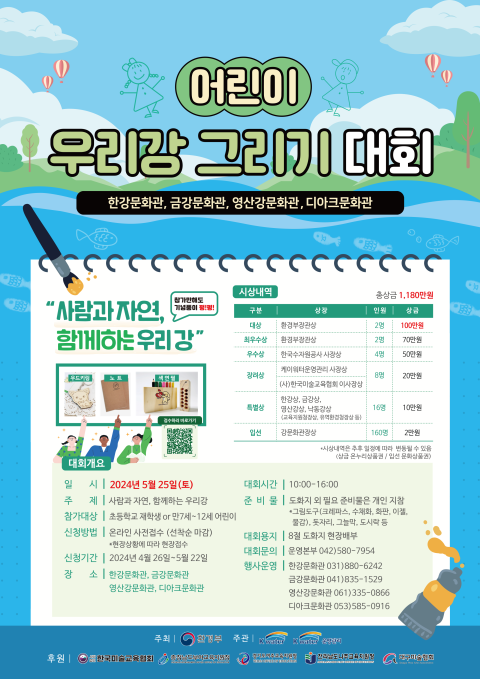 이번 ‘어린이 우리강 그리기 대회’는 ‘사람과 자연, 함께하는 우리 강’이라는 주제로 진행되며, 어린이들의 예술적 재능을 개발하고, 우리 강과 자연사랑의 마음을 고취하고자 기획됐다. 대회는 경기도 여주(한강문화관), 충북 부여(금강문화관), 대구 달성군(디아크문화관), 광주 남구(영산강문화관)에 위치한 4개 강문화관에서 동시 진행하며, 그리기대회 이외에도 버블쇼, 인형극, 퍼레이드공연, 페이스페인팅 등 다양한 볼거리와 체험거리가 동시에 진행된다.