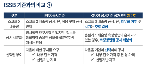 또한 ▲연결기준 공시에서 관할권별로 온실가스 배출량 측정 방법이 혼재되어 있는 경우 측정 방법별로 공시를 세분화하도록 하고 ▲기후 관련 사안에 대해 공시를 생략할 경우 그 사실과 근거를 기술하도록 하며 ▲공시에서 기간을 언급할 때 단기는 공시 기간 종료일부터 1년, 중기는 1~5년, 장기는 5년 이후로 정의한 것도 ISSB 기준과 다른 점이다.