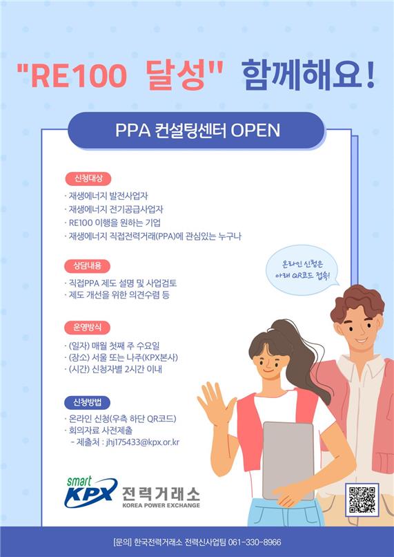 전력거래소는 오는 6월부터 매주 첫째 주 수요일 서울 또는 전남 나주에서 PPA 컨설팅센터를 운영할 계획이다. 참여를 희망하는 기업은 홍보물 내 QR코드를 통해 신청서를 작성 및 제출하면 컨설팅을 받을 수 있다.