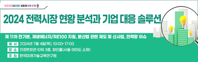 한국미래기술교육연구원(대표 박희정)은 오는 7월 4일 '2024 전력시장 현황 분석과 기업 대응 솔루션 세미나'를 여의도 전경련회관 파인홀에서 온오프라인 병행 개최한다고 밝혔다.