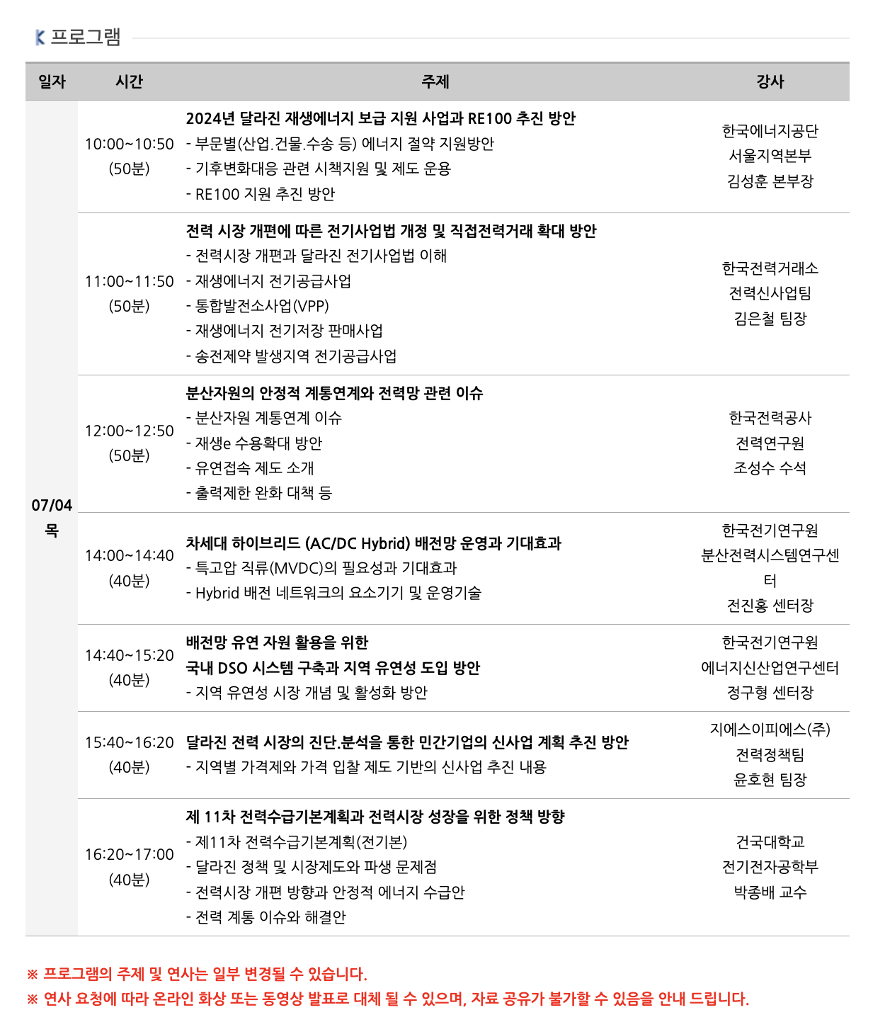 이번 세미나는 ▲'2024년 달라진 재생에너지 보급 지원 사업과 RE100 추진 방안' ▲'전력 시장 개편에 따른 전기사업법 개정 및 직접전력거래 확대 방안' ▲'분산자원의 안정적 계통연계와 전력망 관련 이슈', ▲'차세대 하이브리드 (AC/DC Hybrid) 배전망 운영과 기대효과' ▲'배전망 유연 자원 활용을 위한 국내 DSO 시스템 구축과 지역 유연성 도입 방안' ▲'달라진 전력 시장의 진단/분석을 통한 민간기업의 신사업 계획 추진 방안' ▲'제11차 전력수급기본계획과 전력시장 성장을 위한 정책 방향' 등의 주제 발표가 예정돼 있다.